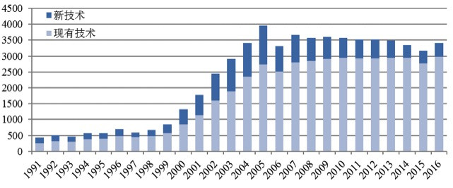 ͼÖн«IPC·ÖÀàºÅÊýÄ¿½üËÆËã×÷ÊÖÒÕµÄÊýÄ¿£¬£¬£¬£¬£¬£¬£¬£¬ÉîÀ¶É«ÌåÏÖÎôʱзºÆðµÄÊÖÒÕ£¬£¬£¬£¬£¬£¬£¬£¬Ç³À¶É«ÌåÏÖÎôʱ֮ǰÒѾ±£´æµÄÊÖÒÕ¡£¡£¡£¡£¡£Í¼ÖÐÏÔʾ£¬£¬£¬£¬£¬£¬£¬£¬È¼ÁÏµç³ØÊÖÒÕÔÚ1999Äêǰºó£¬£¬£¬£¬£¬£¬£¬£¬ÐÂÊÖÒÕºÍÒÑÓÐÊÖÒÕͬ²½¿ìËÙÔöÌí£¬£¬£¬£¬£¬£¬£¬£¬Éú³¤µ½2006Ä꣬£¬£¬£¬£¬£¬£¬£¬Ëæ×ÅÄê¶ÈÊÖÒÕÊýÄ¿»ù±¾¼á³ÖƽÎÈ£¬£¬£¬£¬£¬£¬£¬£¬ÐÂÊÖÒյıÈÀý·ºÆðϽµÇ÷ÊÆ£¬£¬£¬£¬£¬£¬£¬£¬·´Ó¦³öÐÐÒµÊÖÒÕÇ÷ÓÚ³ÉÊì¡£¡£¡£¡£¡£