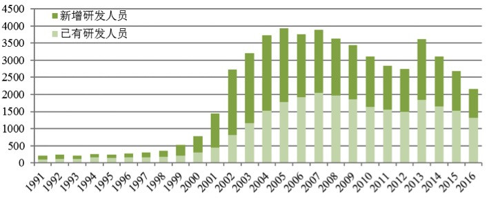 ͼÖÐÂÌÉ«ÌåÏÖÎôʱͶÈëµÄÐÂÔöÑо¿Ö°Ô±£¨ÕâЩÑо¿Ö°Ô±Ö®Ç°Î´ÉêÇë¹ýרÀû£©£¬£¬£¬£¬£¬£¬£¬£¬Ç³ÂÌÉ«ÌåÏÖÎôʱͶÈëµÄÏÖÓÐÑо¿Ö°Ô±£¨ÕâЩÑо¿Ö°Ô±Ö®Ç°ÒÑÓÐרÀûÉêÇ룩¡£¡£¡£¡£¡£Í¼ÖÐÏÔʾ£¬£¬£¬£¬£¬£¬£¬£¬2000ÄêǰºóȼÁÏµç³ØÊÖÒÕÁìÓòÑз¢Ö°Ô±×îÏÈ¿ìËÙÓ¿È룬£¬£¬£¬£¬£¬£¬£¬ÓÈÆäÔÚ2005ÄêÕâ¸öÇ÷ÊÆÔ½·¢ÏÔ×Å¡£¡£¡£¡£¡£×ÜÌå¶øÑÔ£¬£¬£¬£¬£¬£¬£¬£¬ÐÂÔöÑо¿Ö°Ô±Ò»Ö±½øÈëÕâ¸öÐÐÒµ£¬£¬£¬£¬£¬£¬£¬£¬Õ¼Óнü°ëµÄ±ÈÖØ¡£¡£¡£¡£¡£